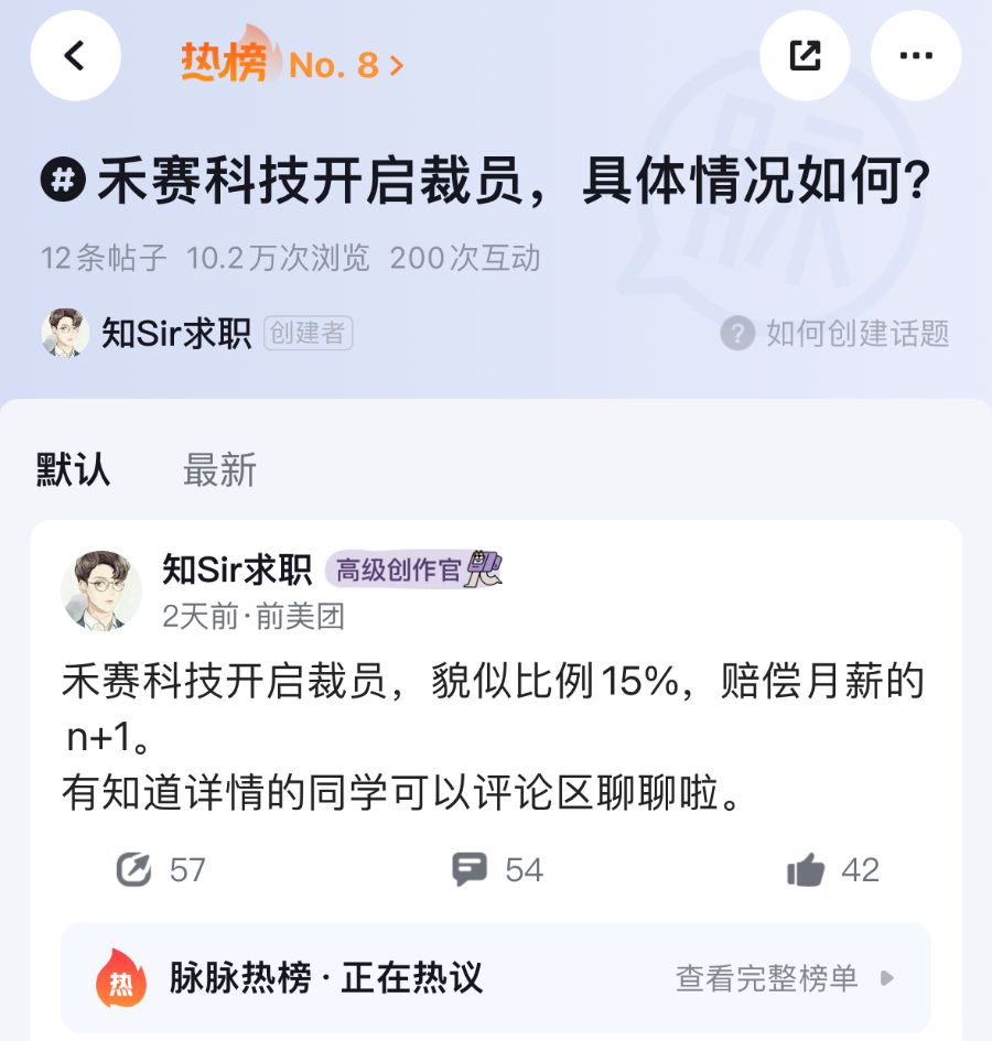 激光雷达龙头禾赛科技被爆裁员去年三季度营收54亿观车论链 日前,职场APP脉脉爆料称,禾赛科技开启裁员,登上平台热搜榜。相关消息称,裁员比例15%,赔偿月薪的N+1。...